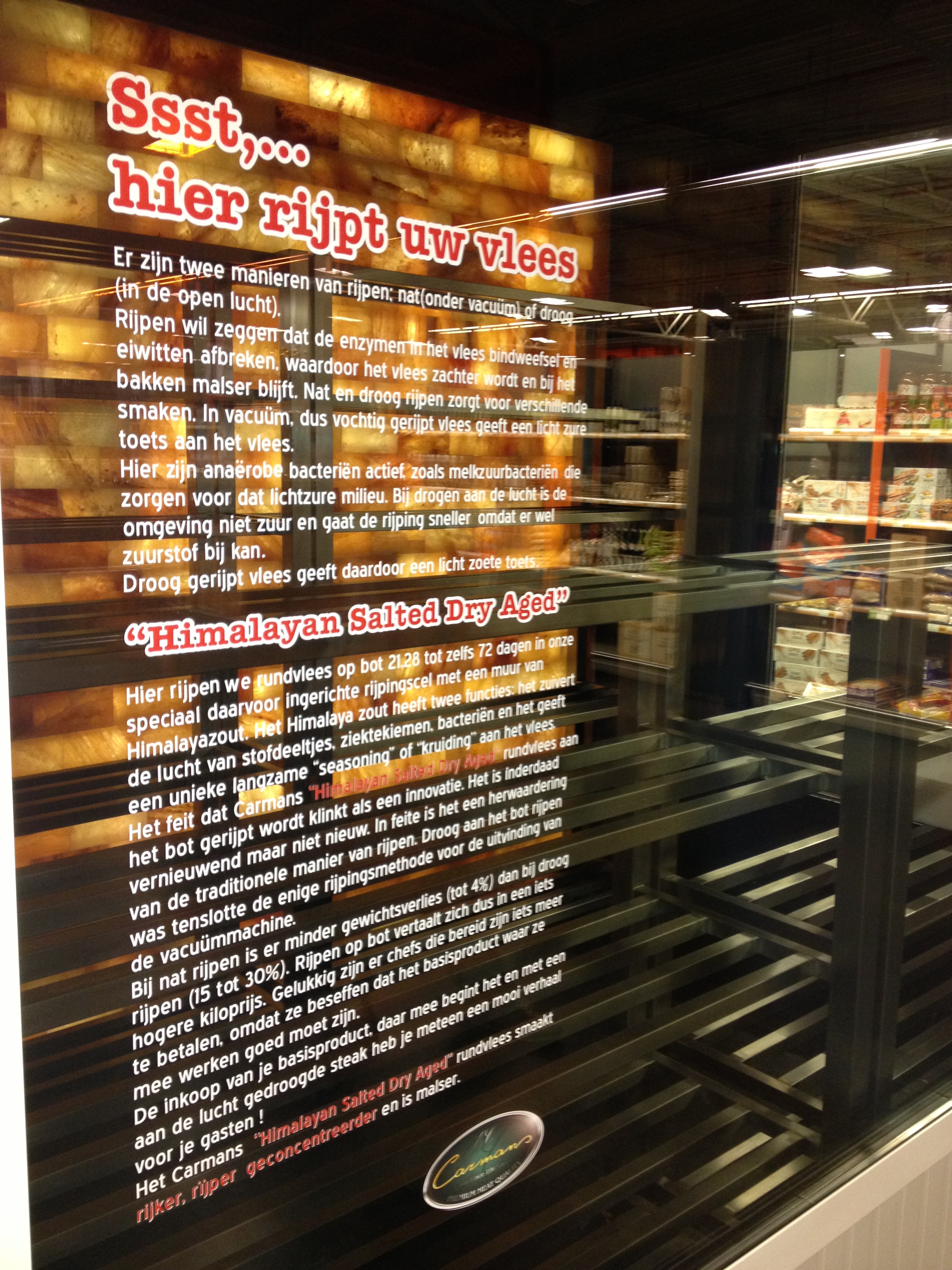 Op vraag van onze klanten rijpen we ons rundvlees tot 72 dagen op bot in onze speciaal daarvoor ingerichte rijpingscel. In die cel bevindt zich bovendien een Himalayazoutmuur welke twee functies heeft: het zuivert de lucht van stofdeeltjes, ziektekiemen, bacteriën en het geeft een unieke langzame ‘seasoning’ of ‘kruiding’ aan het vlees.